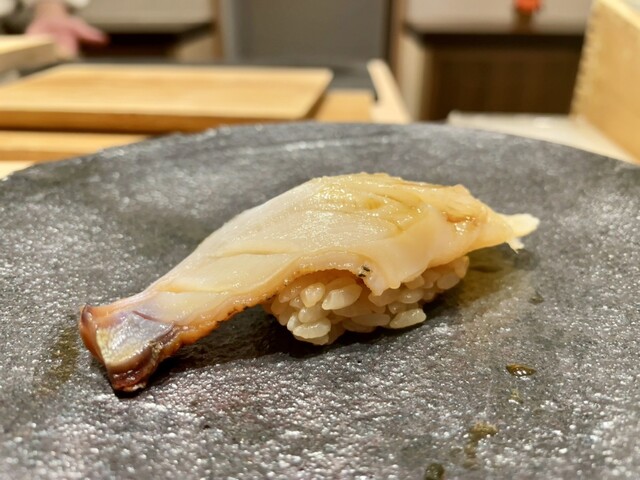…皮目を軽く炙る憎い演出で、淡白上品な身厚の白身の歯応えとほんのりとした甘みと旨みを存分に感じられる白身のネタとしては最高の一品!