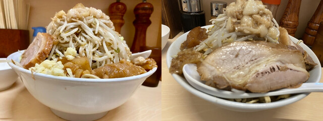 トッピングはほぼ共通で大きい豚(チャーシュー)、もやしとキャベツの野菜、生のニンニク、そして背脂です。