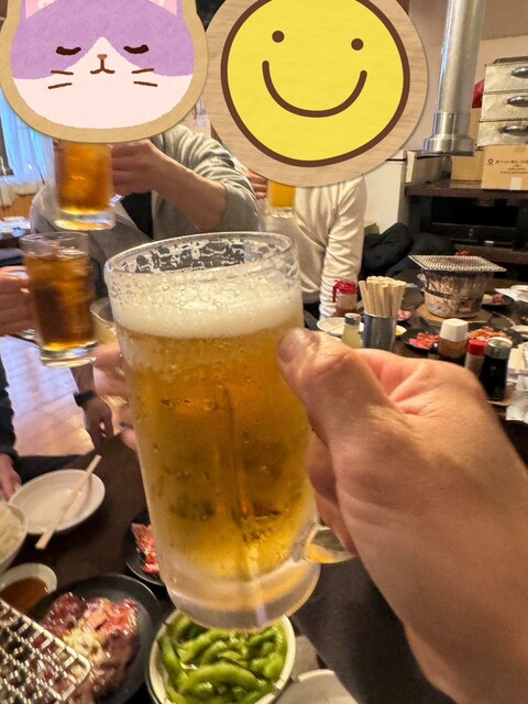 チョリソー ニンニクホイル焼き 餃子 ポテトフライ おにぎり 大根サラダ 牛タン 豚タン ハラミ カシラ カルビ 上ミノ 豚トロ コブクロキムチ ビール コーラ