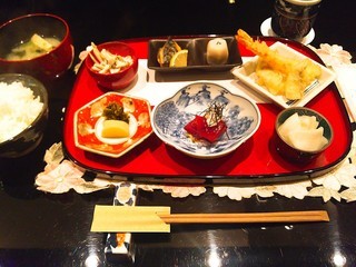 ◆日替り980円(大海老の天丼、小鉢、お米のぷりん付)