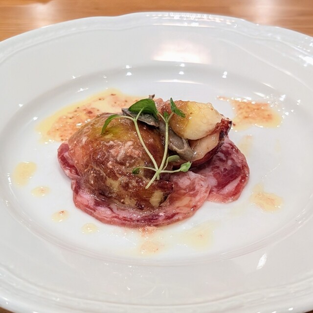 梅山豚のモルタデッラに洋梨とペコリーノサルド。