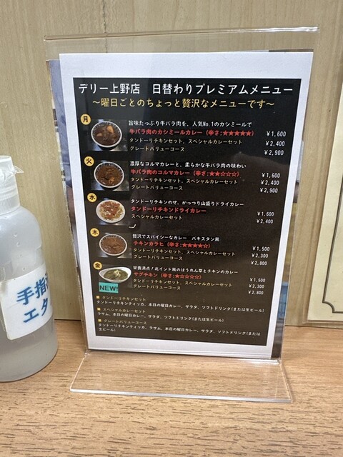 これで日替りプレミアムメニューをコンプリートと思ったら、日替りメニュー表が新しくなっており、金曜日がイカスミカレーからほうれん草とチキンのカレーに変わっていました。