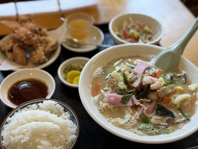 来々軒さんで初めてちゃんぽんを注文です。ボリューム満点セットの中から唐揚げちゃんぽんセットをチョイス。セルフのコーヒーはしっかりアイスで飲めるようグラスに氷を入れてアイスキャビネットの中に準備されてます。この気配り、嬉しいですね。さて、肝心の料理ですがちゃんぽんはかなりあっさりです。鶏ガラの出汁、イカ・エビ・アサリといった魚介の出汁、どちらもパンチが弱い感じですね。私的には少し物足りない感じです。反してカラっと揚げられた唐揚げは醤油、ニンニクなどで下味がつけられそのままでも美味しい、そこになぜか餃子のたれ、でもこれが唐揚げに合うんです。これは新たな発見。ちゃんぽんは少し期待外れでしたが唐揚げのおいしさを知ることができるランチでした。また来ます。ごちそうさまでした。