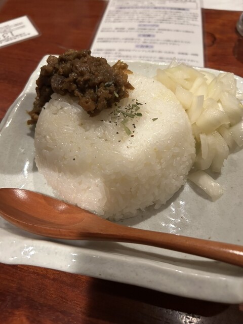 ライスもメニュー表に書いてある通り香り高いし、タマネギのピクルスは食感もいいし、酸っぱすぎずうまい。かかってるキーマカレーだけでもいける。