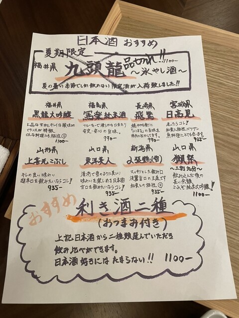店内には豊富な種類の日本酒が揃っており、「利き酒二種(おつまみ付き)」という魅力的なメニューもあります。次回は日本酒好きの友人と再訪し、様々な日本酒を試してみたいです。