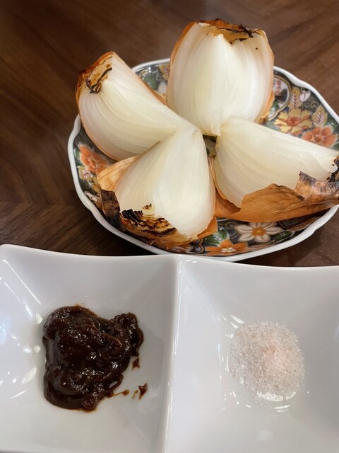 炉端野菜「淡路玉葱」:もう一つのおすすめは淡路島産の玉ねぎを丸ごと焼いた一品です。ほんのりとした甘みが特徴で、玉ねぎ本来の旨みが凝縮されています。