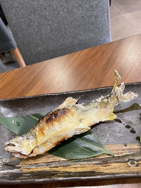原始焼き「あゆ」:お店のおすすめメニューである鮎の原始焼きは、焼き上がりに時間がかかるため、早めに注文するのがおすすめです。焼きたては香ばしく、ふっくらとした身が特徴で、自宅ではなかなか味わえない贅沢な一品です。