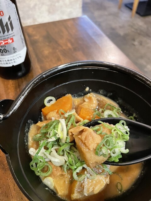 席に着くと、テーブルのメニューにある二次元コードを読み取って注文します。 最初に運ばれてきたのは「アサヒドライゼロ」と、嬉しいお通しの「もつ煮」!このもつ煮、なんとおかわり自由なんです!しっかり味が染み込んでいて、根菜もゴロゴロ入っていて食べ応えがあります。ノンアルコールビールもクオリティが高く、最初から期待が高まります。