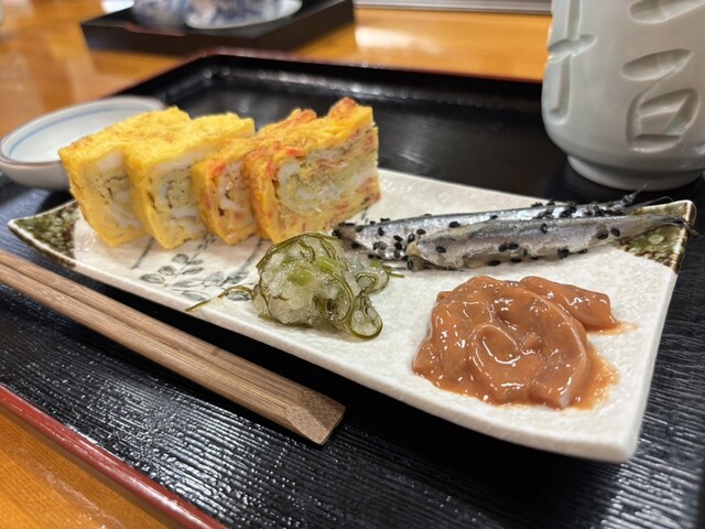卵焼きは香りと食感が良い胡麻入り!煮椎茸、塩辛、南蛮漬けはどれも絶品!お酒が欲しくなります♪