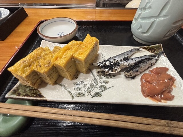最初にたまごやき、胡麻イワシ、塩辛が提供されます。イワシは冷たいよ!と大将。暑い日にはちょうど良いですね!