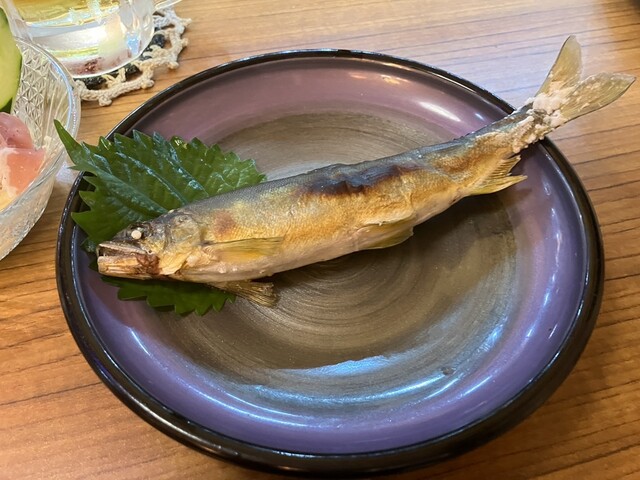 あゆの塩焼き子持ちで油が乗っており、ハンバーガーは肉厚でボリューム満点!
