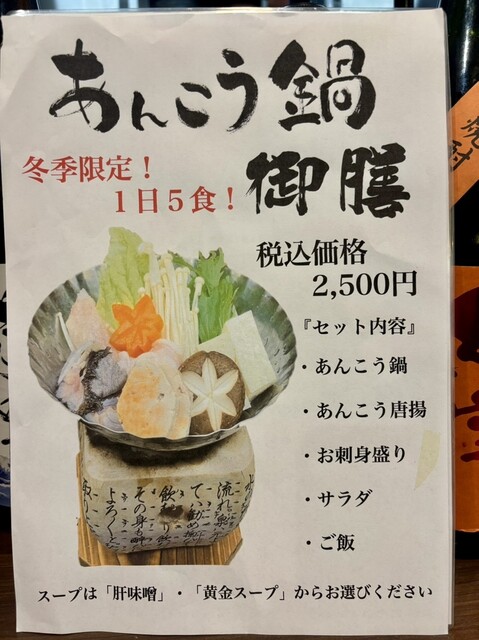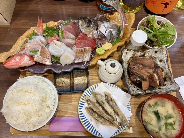 お刺身御前にめひかり唐揚げとあら煮が付いた「極」(2,200円)をご飯大盛りでお願いしました。