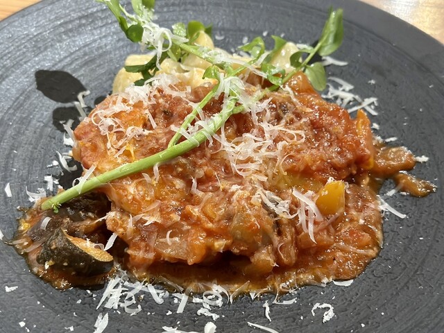鶏肉のトマト煮込みは鶏肉がやわらかく、トマトソースは甘め、他にも茄子やパプリカもありました!ニョッキも添えてあり、モチモチでした!この鶏肉のトマト煮込みはかなり美味しかったです✨✨ライスも結構なボリュームでした!