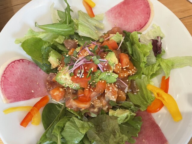 外のテラス席で、ペットokの和食やさん。駐車場も、満車で、枠外に案内された。外のテラス席も、防寒ができていて、ストーブも焚かれていて、暖かい。犬用のメニューも完備。席に着いたら、犬用のボーロ、クッキ...
