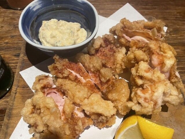 先ずは、生中。ジョッキも冷えてます。お通しは、鶏皮ポン酢、更に睡蓮花サラダ、串焼きで、皮、ハツ、砂肝、トマト豚バラ、アスパラ豚バラ、鶏もも一枚揚げダブル、ネギ間、ズリ、ひざなん、つくねの黄身ソースたたき玉。焼き鳥は、コリコリだったり、カリカリだったりでうまい。ネギ間は、鶏がふんわりしていて、最近たべたなかでは、1番。