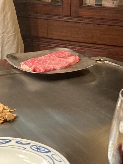 鉄板を前にしたカウンター席に座り、目の前でシェフが仕上げる料理を目でも堪能しつつ、すべての料理をワインと共に頂きました。