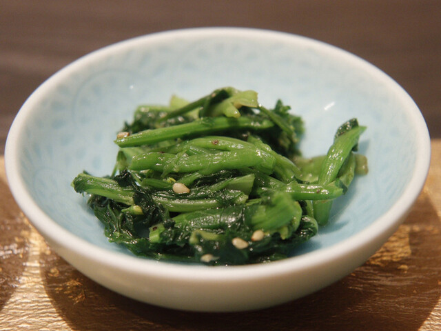 ~小鉢、左から、ザーサイ、ハチノスアンチョビ、オクラの漬物、キノコのアヒージョ