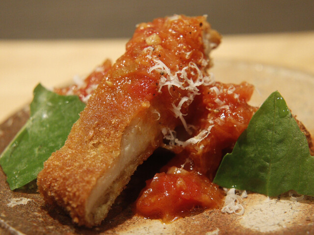 ~ハチノスのカツレツ チリトマトソース、パルミジャーノ、バジル