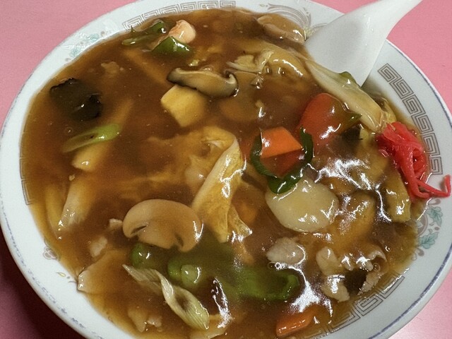 量多め。醤油あんかけで野菜たっぷり。中太麺。