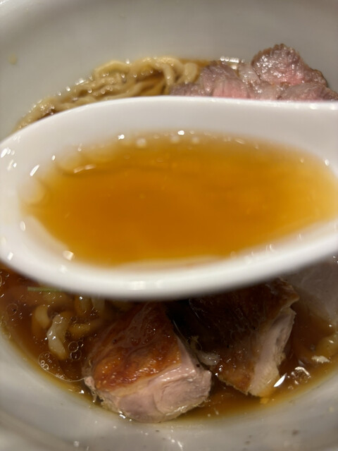 淡麗系の醤油でさっぱりとした中、オイリーな旨み、コクがふんだんに口の中に広がる感じ。複雑な味わいで表現が難しいが兎に角美味い!手揉み麺(?)がモチモチでちぢれがスープの旨みを絡め取りとても美味い♪豚肉、鶏肉共に味わい深い逸品^ ^