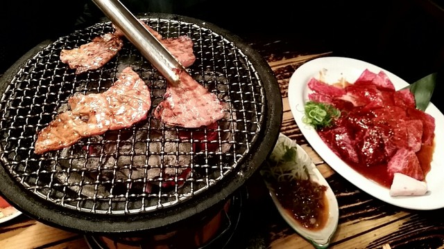 上カルビ・上ロース・上ハラミと桜ユッケ、大根サラダを頼みました。