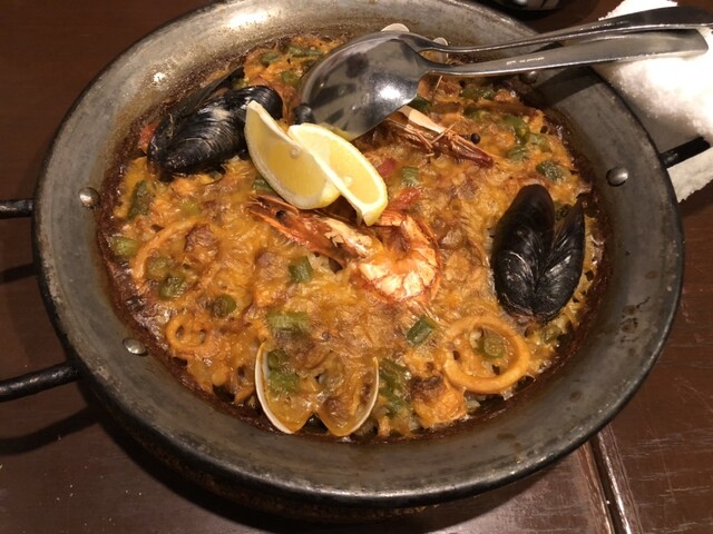 前菜は、マリネ系などが多く、サッパリしていましたが、アヒージョ、豚肉とガッツリとしていき、パエリアで締めで、初めはお腹膨れるのかなーと思っていましたが、終わりにはしっかりお腹いっぱいになりました。アヒージョの時に、一緒にきたじゃがいもパンが、とても美味しかったです!