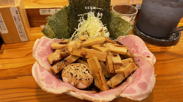 今回は、特上黒チャーシュー1170円+味玉120円を注文しました。