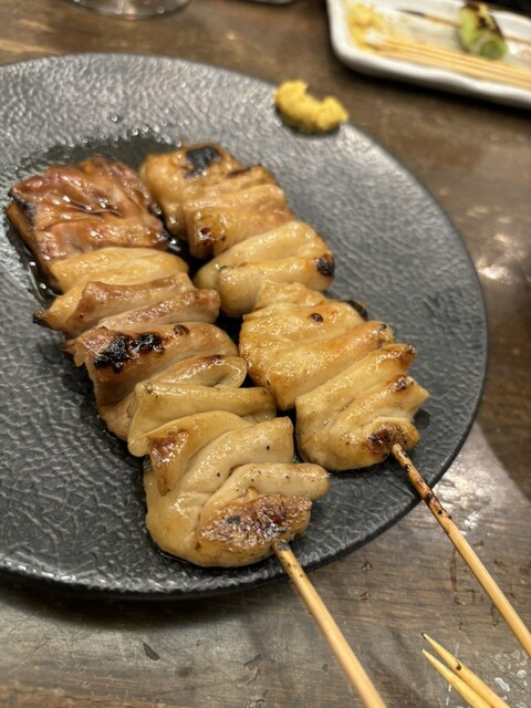 評判を聞いて乍、焼き鳥と言えばやむちゃん一択だった事もあって中々行く機会の無かった三政さんに、初探訪。噂に違わぬ美味しさに感激の連続でした。予習していたので、箸の代わりに出てくる串2本にも戸惑わず、テッパンの混合(ハツやマメ、レバーなど)勿論の事、特にピーマンの肉詰めと鴨皮(←皮だけでなく、肉もしっかり付いてる)は落涙モノの美味さ。この日はハラミの仕入れは無かったけど、代わりにと言ってお勧め頂いた牛のランプ肉は、間にニンニクスライスとシシトウが挟まれている芸の細かさで、此方も感激。金曜夜だった事もあるけど常に満席で、事前予約は必須です。また伺います。