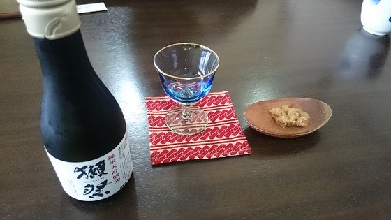 大好きな山口の地酒「獺祭(だっさい)」 800円。サービスの蕎麦味噌付き。