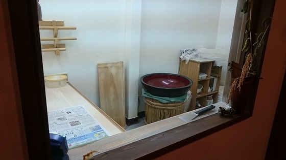 店内からガラス張りの蕎麦打ち室が見えます。