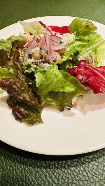 サラダ、パン、ごぼうのポタージュ、白身魚と黒オリーブのトマトソースパスタ、デザート、ドリンク