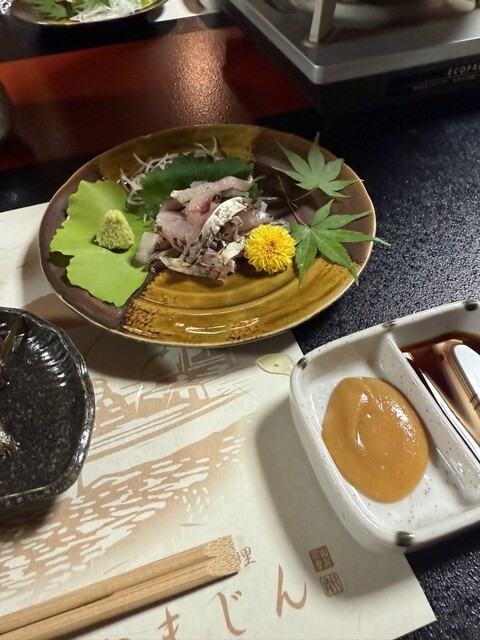 滋賀県の湖岸通りから少し入った近江八幡の休暇村の近くにあります!鮒寿司とかの近江の特産品を作っているお店がしておられる料理屋ですが、料理屋としての店構えは全くありません。しかし玄関を入ればお庭が綺麗に見えて、特別な一組のために部屋が設えてあります。さて、特筆すべきはその料理の内容です。鮒寿司の美味しさは他の店とは異質ですね。雌より雄の方を勧めるのは卵に頼らず、その手法に自信があると思います。またマタギ鍋と称されている熊鍋は油だらけに見えますが、その油はくどくなく、ごぼうや野菜と一緒に食べると凄く豊かな味わいです。