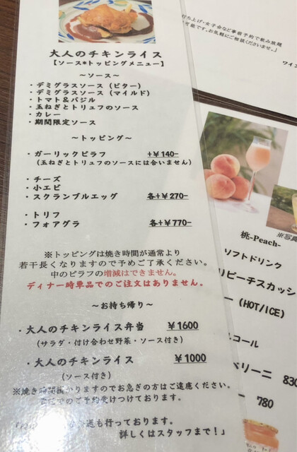パスタコースを予約していたので時間通り二階席へ。ネットで席予約するにはコースを選ぶ必要があります。パスタコースの内容は①前菜:生ハム・海老マリネ・キッシュ・骨付鶏唐揚げ②本日のパスタ③メイン料理:大人のチキンライス&鯛のポワレとムール貝のクリームソース④紅茶・柚子のジェラート&パンナコッタをお願いしました。