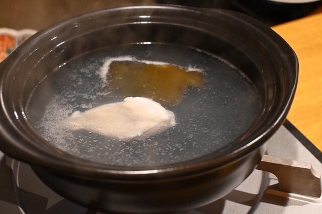 お鍋の用意がされ、中にはフグの身がひとつ。