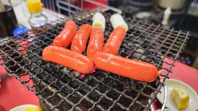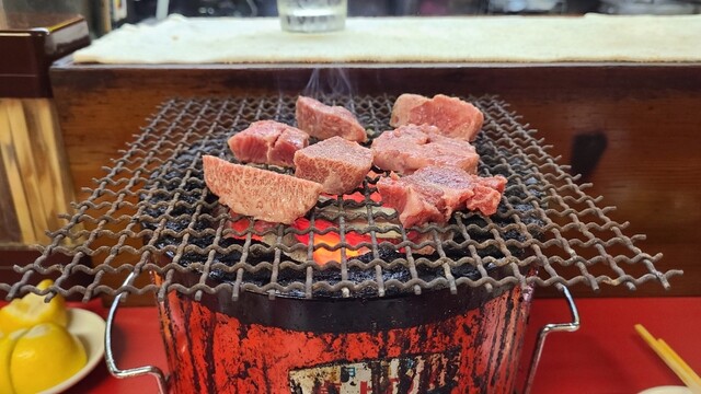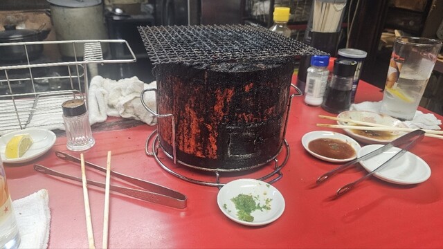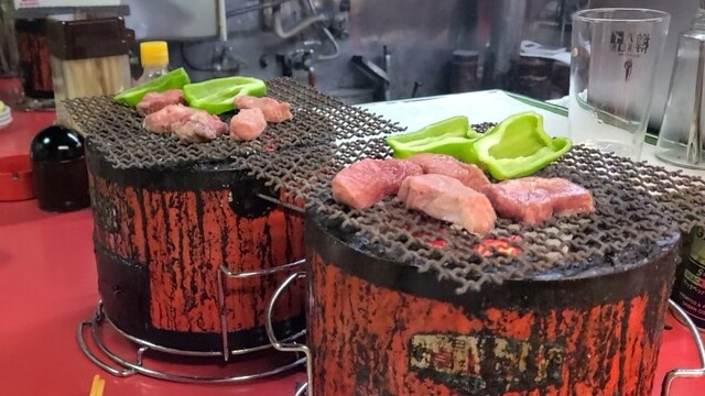 ここで各席に七輪が配られ、大将の焼肉劇場が始まった。