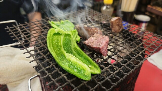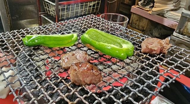 そのコメカミに、マスター独自の味付けを施し、炭火で焼いて、同じく焼いたピーマンに入れて食べる。