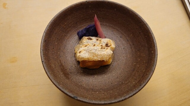 玄米餅で自家製のからすみを挟み焼いたもの。