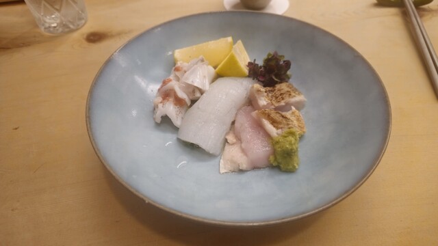 すりながしと前菜に続き、鰯の刺身と、骨と肝を焼いたものが供されます。
