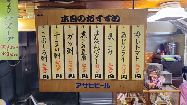 カウンターの手前側に陣取り、瓶ビール(赤星)でスタート。