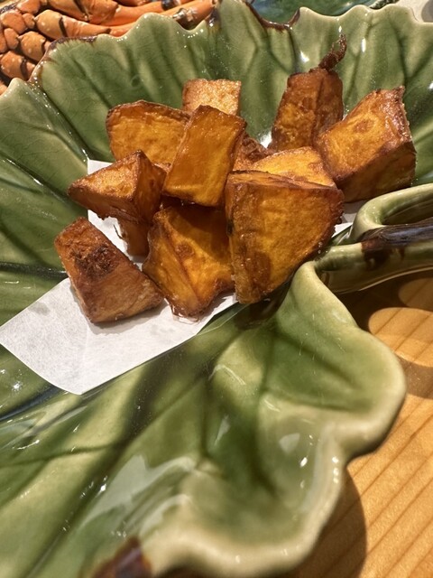 今日のイチオシメニューはかぼちゃの素揚げ。メニューにはないお料理。毎年、さつまいもの素揚げをやってくれるのだが、今の時期さつまいもが完熟していないため、今絶好調で完熟しているかぼちゃを素揚げしてくれた。これがサイコー!かぼちゃの甘味が強く、そして素揚げだから外はカリカリ、中はジューシー、、、言うことなし!