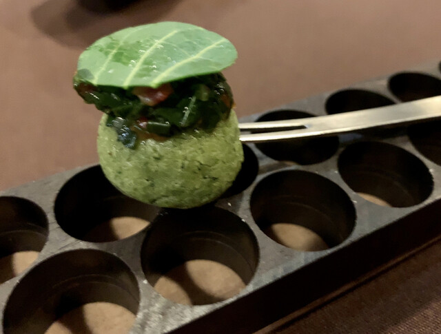 イタリアのドーナツ?ボンボローネとネットリした餅米のアリスクリーム、塩漬けの桜の葉の泡が桜餅の雰囲気になりかなり美味しい塩気を感じるスイーツ