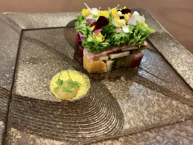 特筆すべきは水ダコと柿の前菜とメインの豚ヒレ肉のローストで水ダコは不思議な食感と旨味を柿がうまく調和させていて素晴らしい(๑˃̵ᴗ˂̵)豚ヒレ肉は絶妙な火加減で見は甘くワインに合う!感激