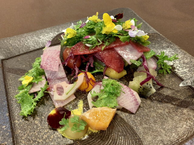 メジマグロとフレッシュ茄子、玉ねぎピクルス、他夏野菜、ビーツ、巨峰、鮮やかなカルパッチョ!特に茄子がフルーティでうますぎる