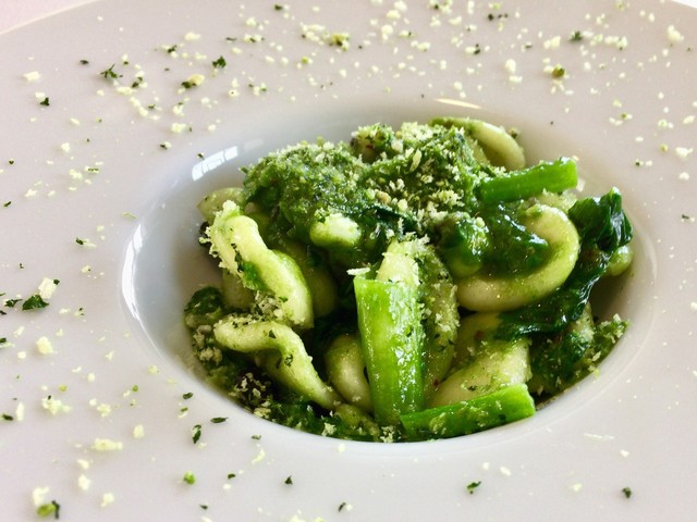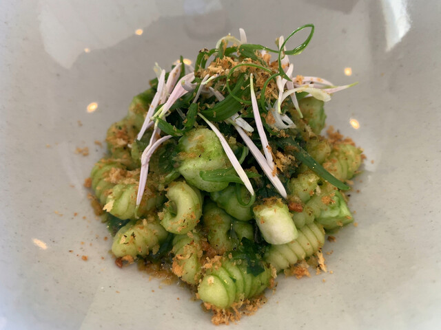 本日はモチモチ食感のニョケッティに菜花の大人なソース、黒鯛の旨味、にんにくパウダーをプラス