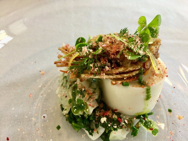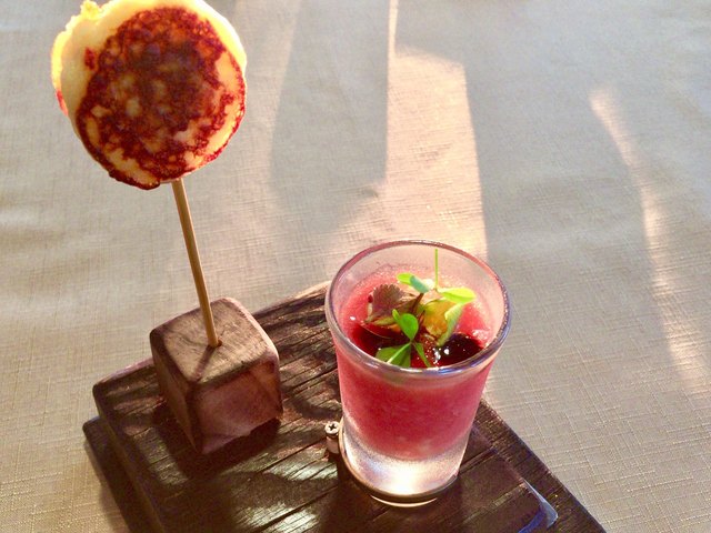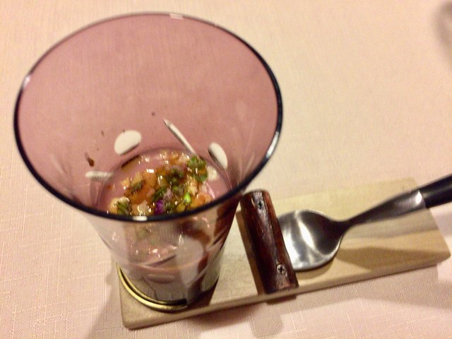 ガスパチョとジャガイモのクレープの前菜で、可愛らしくかつ旨い!