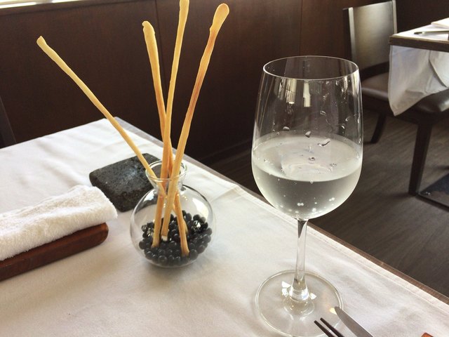 ぽりぽりグリッシーニをつまみながら白ワイン(シャルドネ)で乾杯