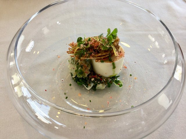 最初のお料理はボタン海老のフリット、ブロッコリーのパンナコッタに春野菜などが散りばめられたものでカリカリの食感やトロリとした旨味が秀逸