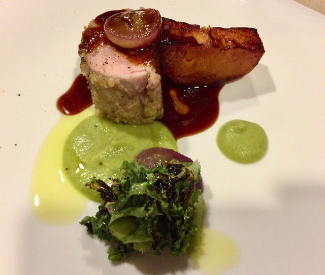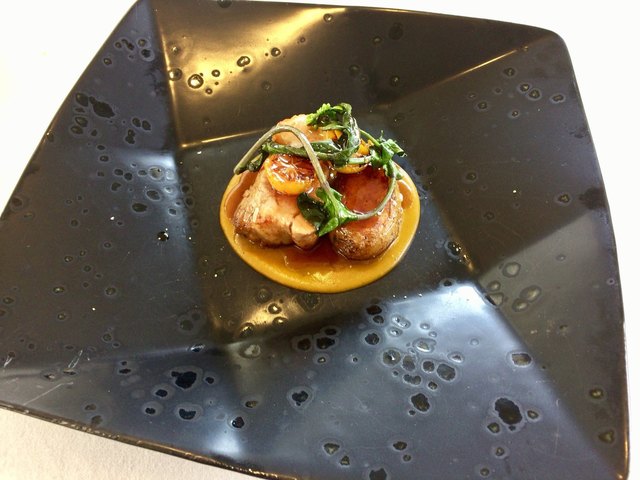 メインはチョイス出来るのですが、鹿児島産の豚のロースト かぼちゃのソース ジャガイモ添えをいただきました 肉の火加減はジャストでジューシー!肉本来の甘みが感じられ金柑と一緒にいただくとなお、美味かった