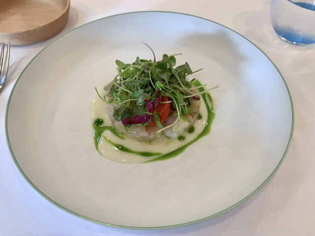 イサキのマリネ、焼き茄子タルタル、クリームソース