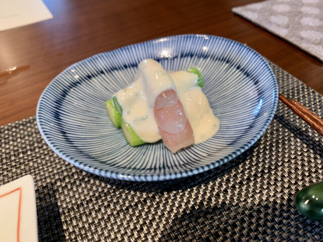 カンパチネギ生姜山椒のソース・ガス海老